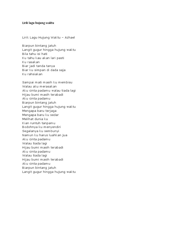 Aku cinta padamu walau tiada lagi hijau bumi masih terabadi. Lagu tersebut dirilis pada 2002 dan dimuat dalam album studio ketiga mereka bertajuk 07 Des. LIRIK LAGU AZHAEL - HUJUNG WAKT.